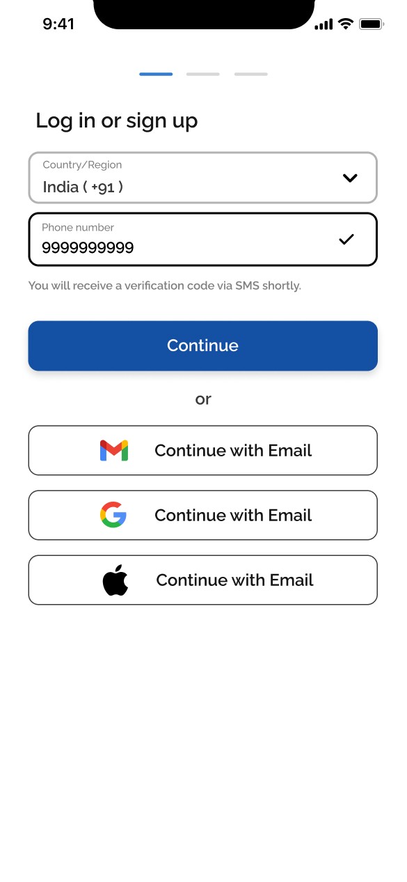 Users can login using their credentials or with their Email, Google or Apple account. If they don’t have an account they can signup using their new credentials